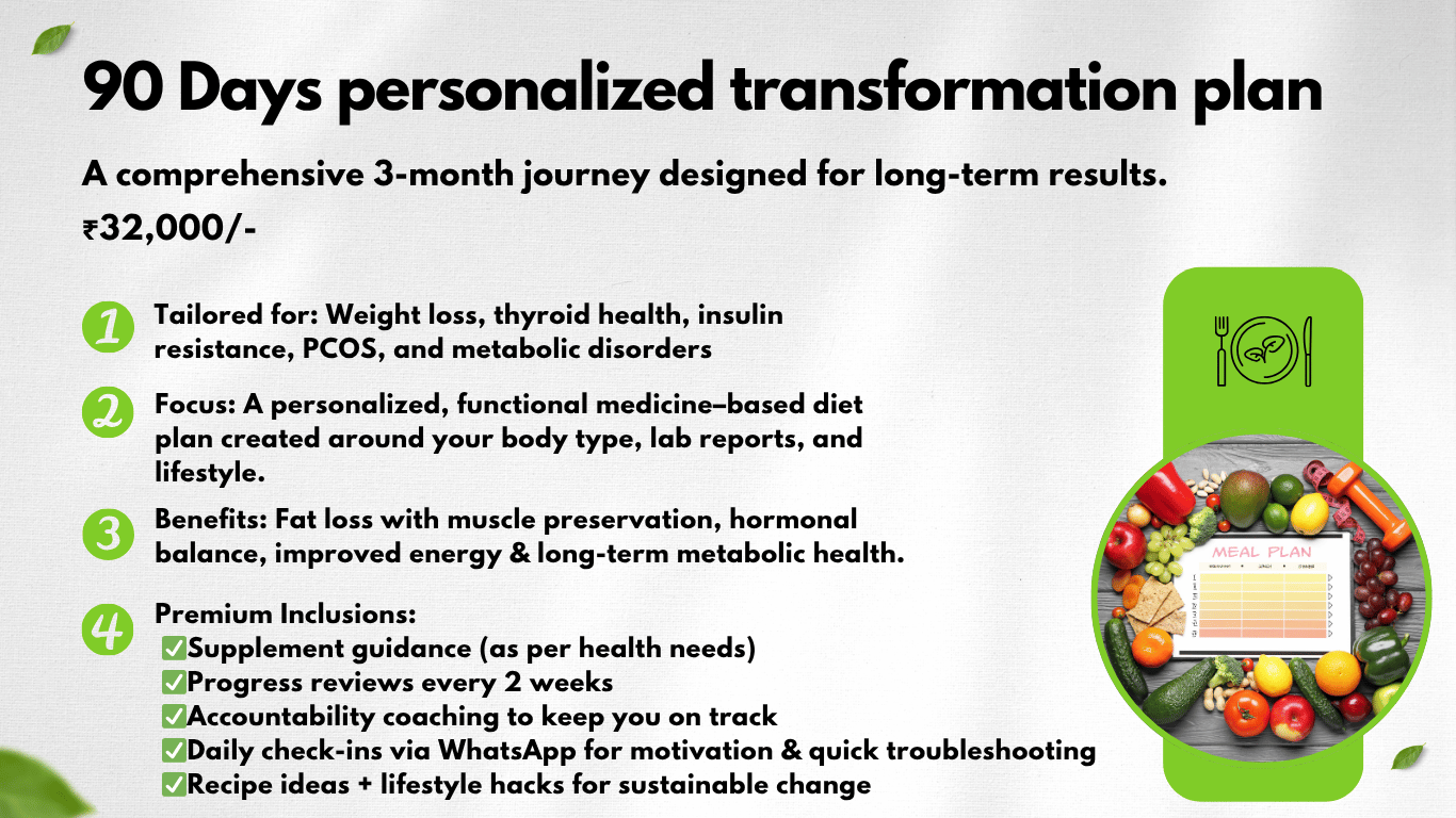 • Focus: A personalized, functional medicine–based diet plan created around your body type, lab reports, and lifestyle.